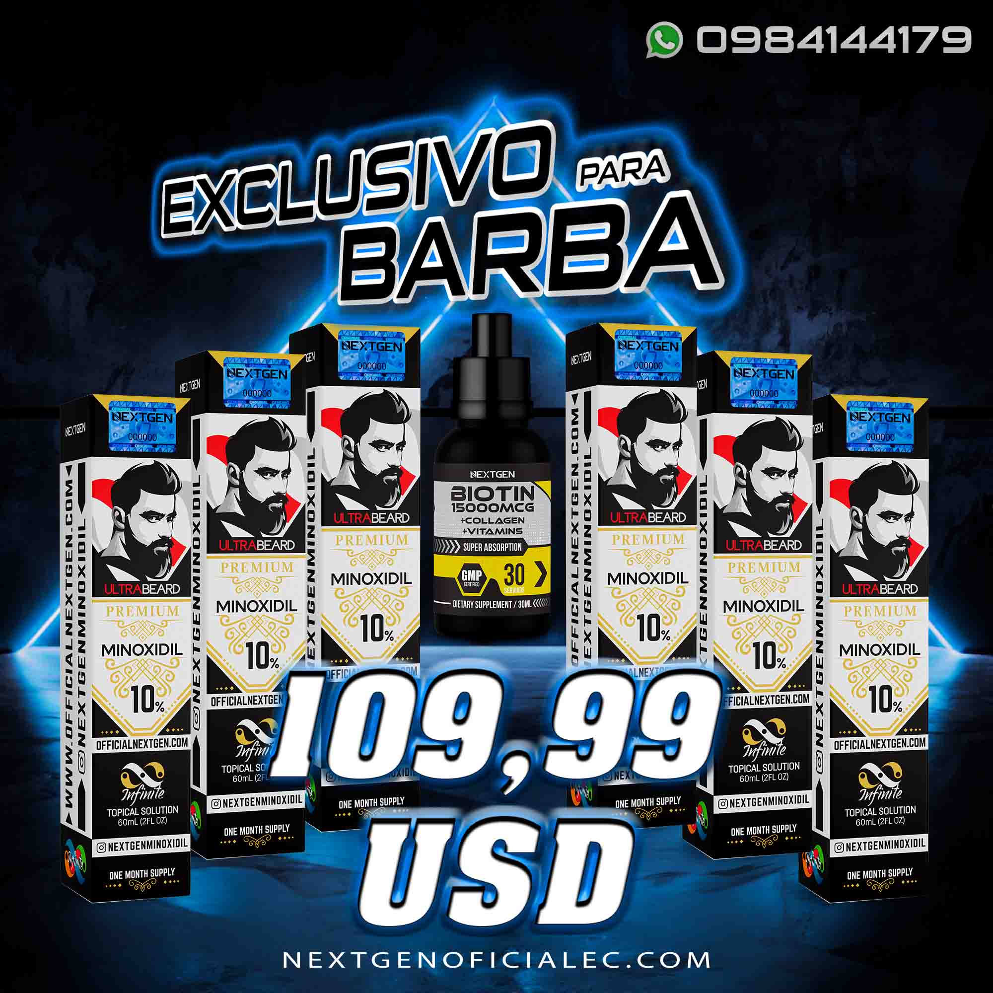 6 frascos de Premium 10% Minoxidil: Fórmula específica para estimular el crecimiento de la barba.